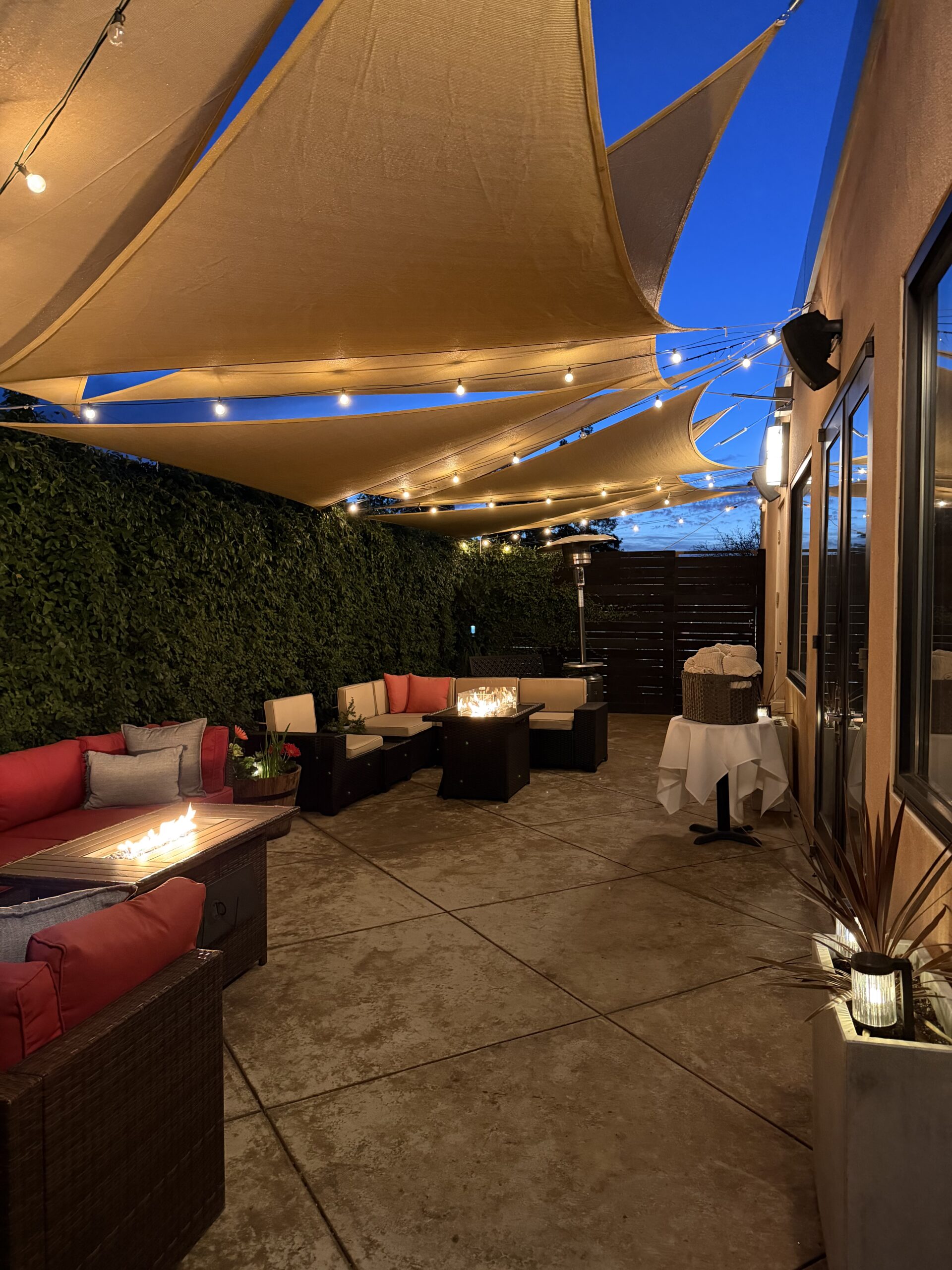 Dine in comfort on our beautiful shaded patio, featuring a cozy fire pit that creates the perfect ambiance.